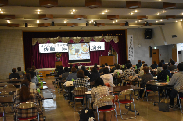 10月29日、JA北いぶき女性部(山本清美部長)は、本所にて3年に1度開催している女性部加入推進イベントを実施しました。今回のイベントにはHTB放送の番組「おにぎりあたためますか」にて16年間MCを担当されたフリーアナウンサーの佐藤麻美氏をお招きし、講演していただきました。